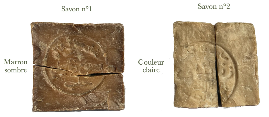 Pour mieux comprendre ces différences, nous allons comparer un savon d'Alep issu de la collection Savon d'Or (savon n°1) avec son imitation (savon n°2).