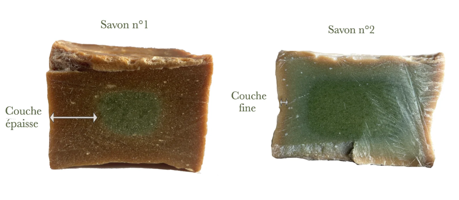 Comme le montre la photo, le savon n°2 possède une couche extérieure fine. À l'inverse, le savon n°1 affiche une aubier nettement plus épaisse, signe d'un savon bien affiné et mature.
